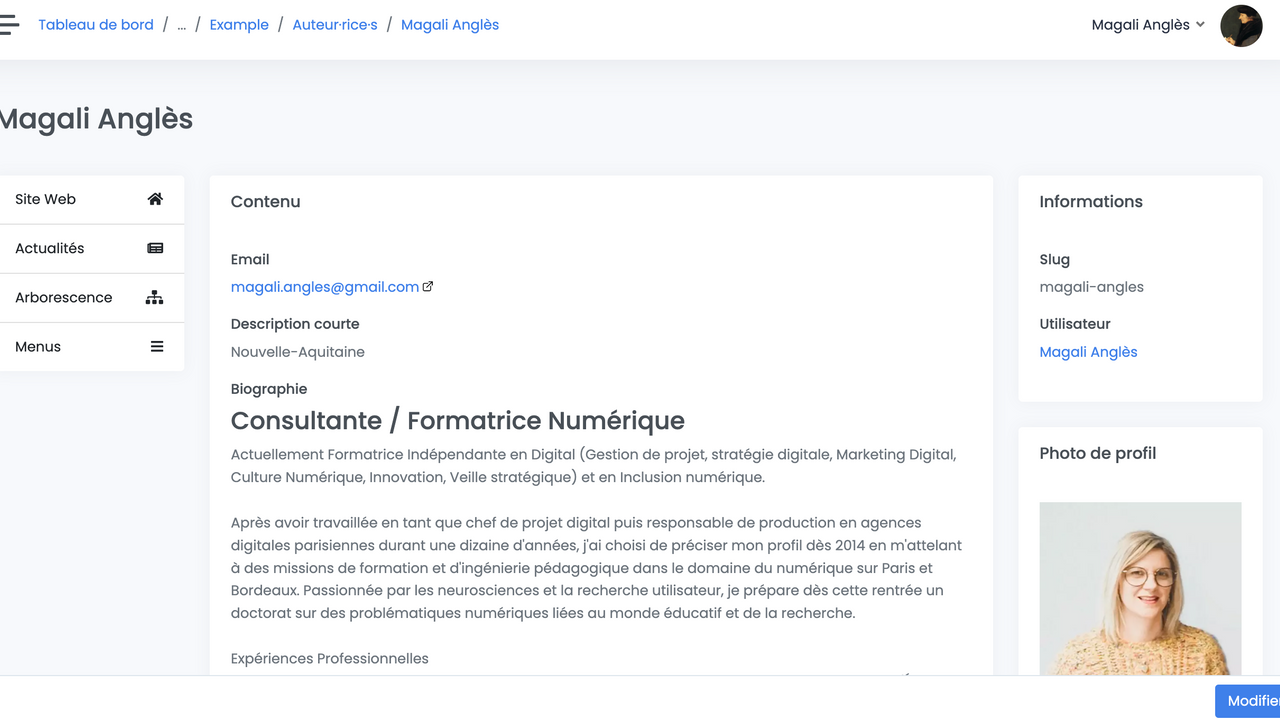 - Actualités : Liste des actualités de l'Auteur.rice / Accès à l'actualité / Accès à la catégorie (lien externe) / Modifier (lien externe) / Supprimer (lien externe)