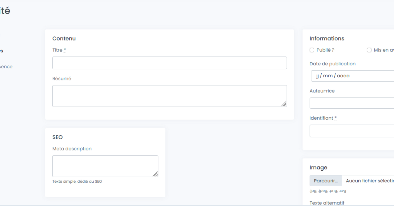 Au clic sur "créer", l'utilisateur arrive sur une page vide pour créer une actualité avec les champs suivants :