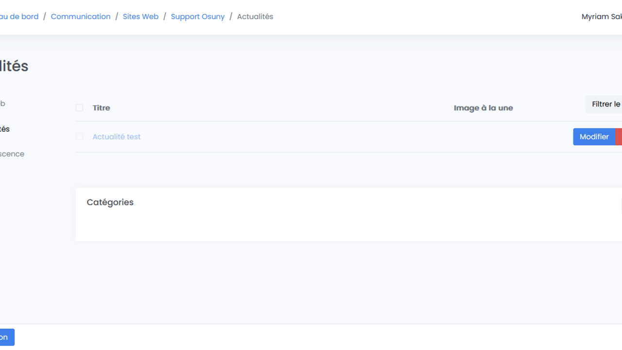 Une fois l'actualité créée, l'utilisateur peut remplir l'actualité par les blocs de contenus (lien externe) en cliquant sur la fiche de l'actualité, sur son nom.