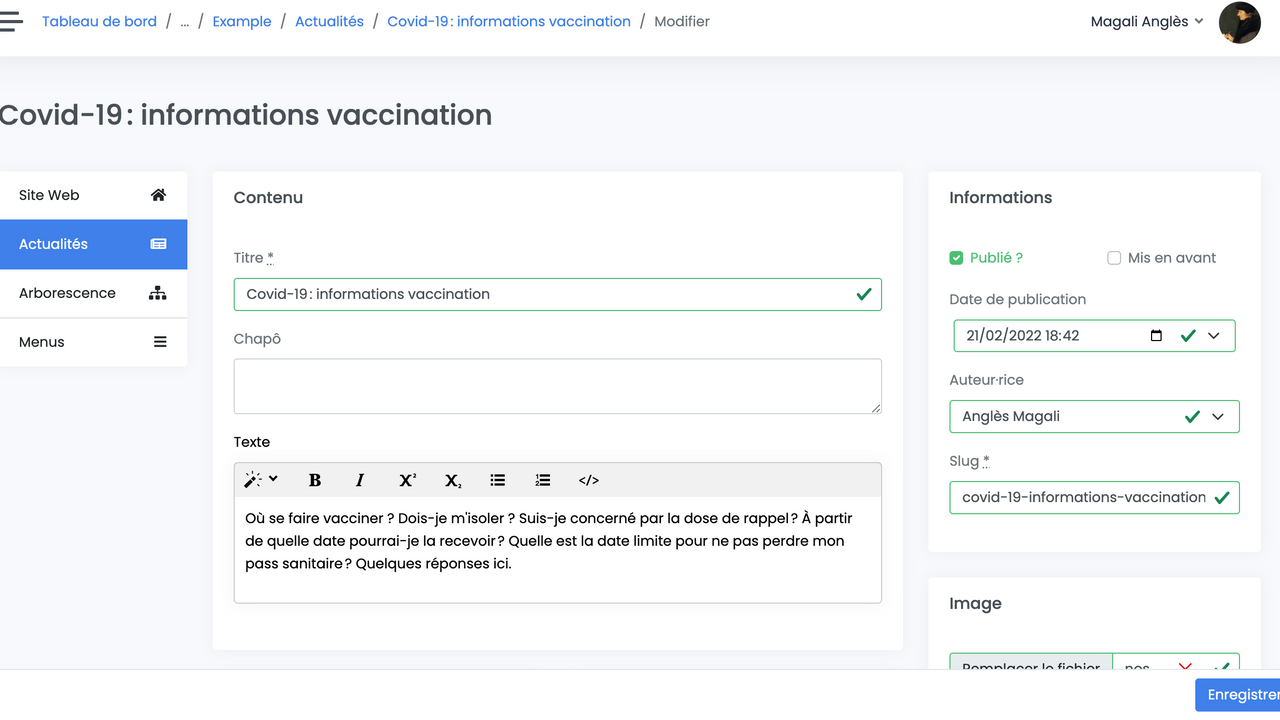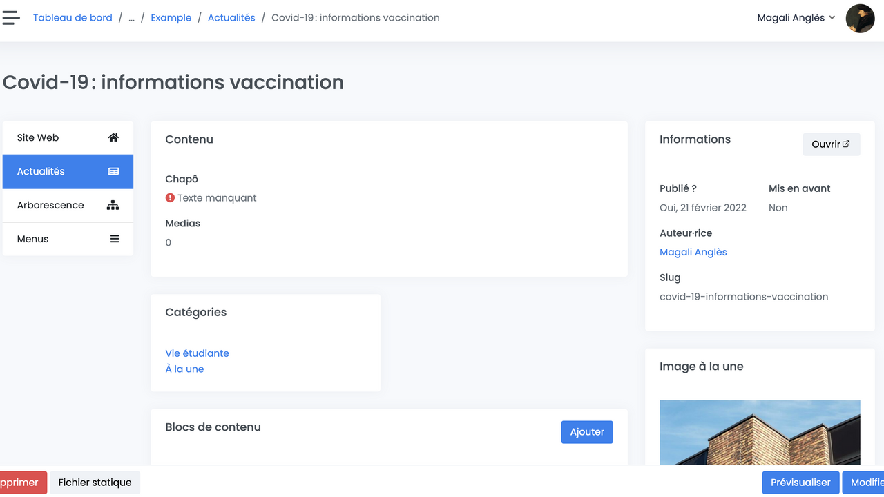 Possibilité de modifier le contenu, les informations, la catégorie, le SEO et l'image de l'actualité.