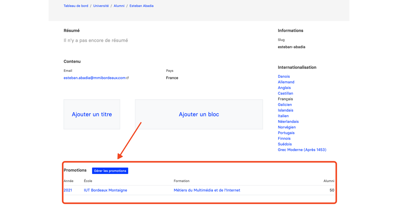 Étape 3 - Gérer les promotions - Vous pouvez cliquer sur "Gérer les promotions" pour gérer les promotions associées à l'alumnus.
