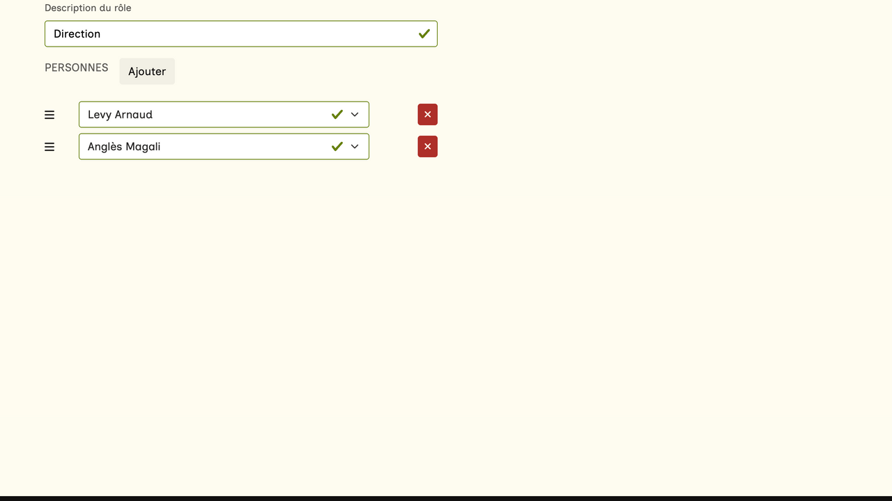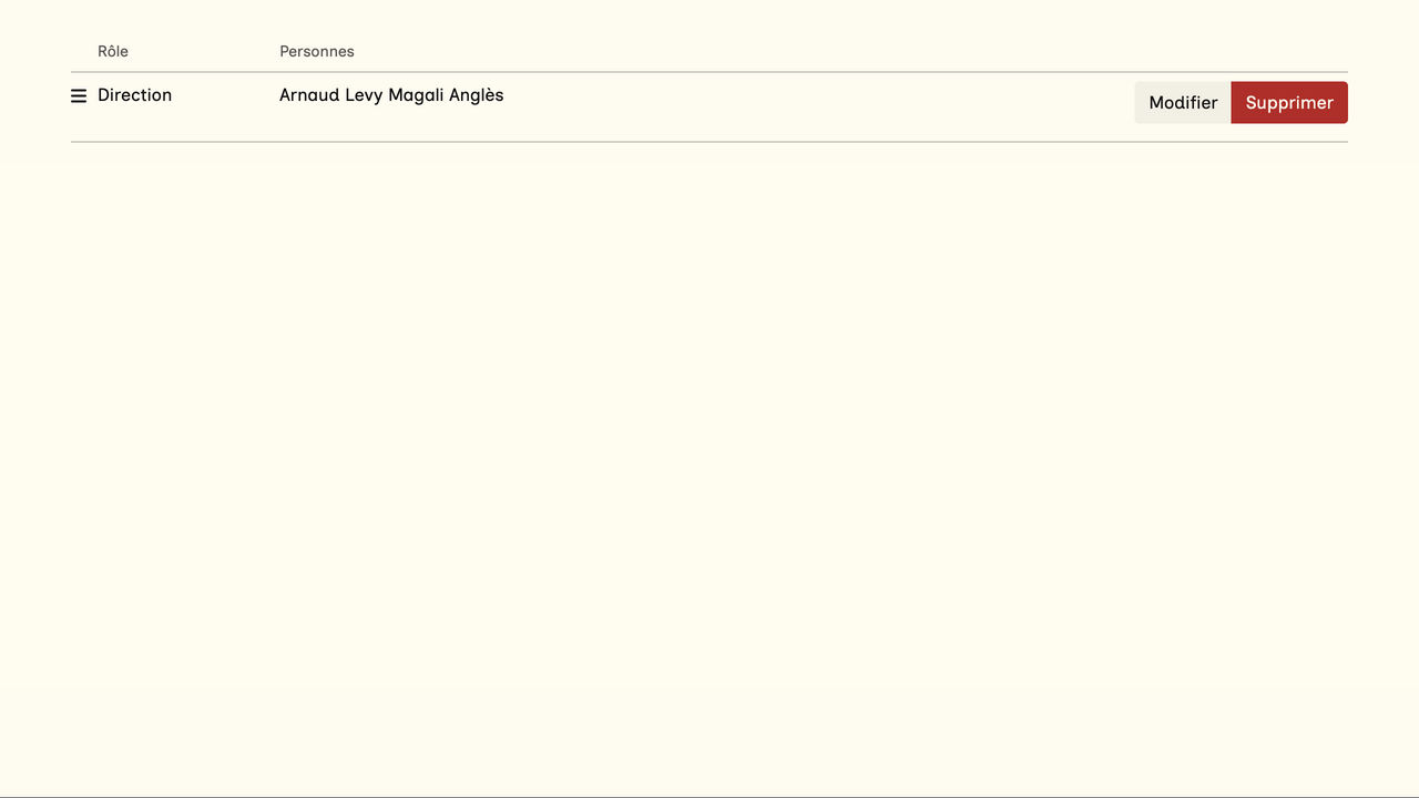 En cliquant sur "Modifier" à côté d'un rôle, vous accédez à la liste des personnes ayant ce rôle. Vous pouvez alors modifier la description du rôle et gérer les personnes, en les supprimant ou en en ajoutant.