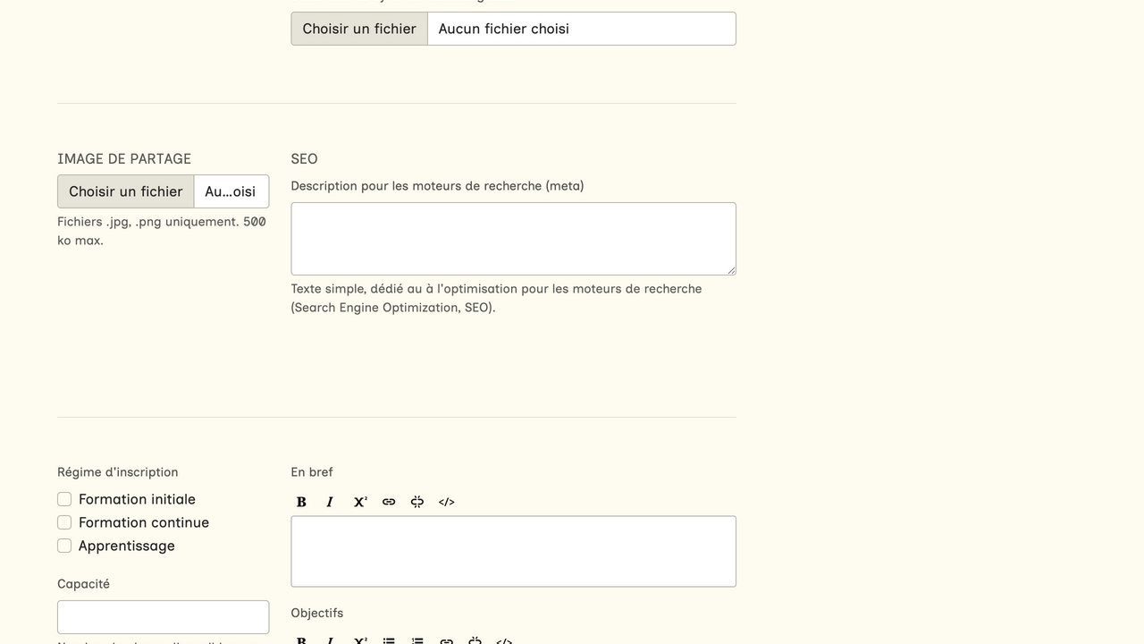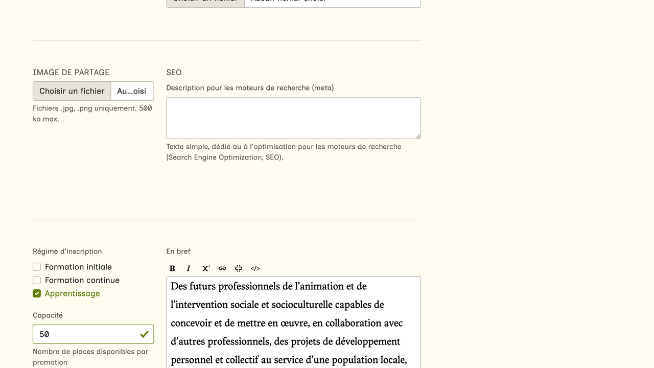 Vous avez accès à une fiche pour saisir les informations de la formation que vous souhaitez ajouter : la présentation de l'établissement, les informations liées à la pédagogie, les résultats, les modalités d'admission, ainsi que la possibilité de rajouter une image, de publier ou non la formation.