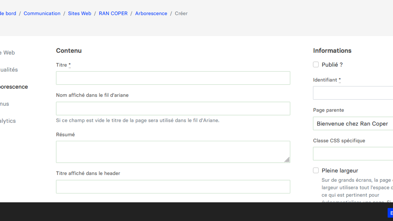 - Contenu : Titre / Nom affiché dans le fil d’Ariane / Résumé/ Titre affiché dans le header