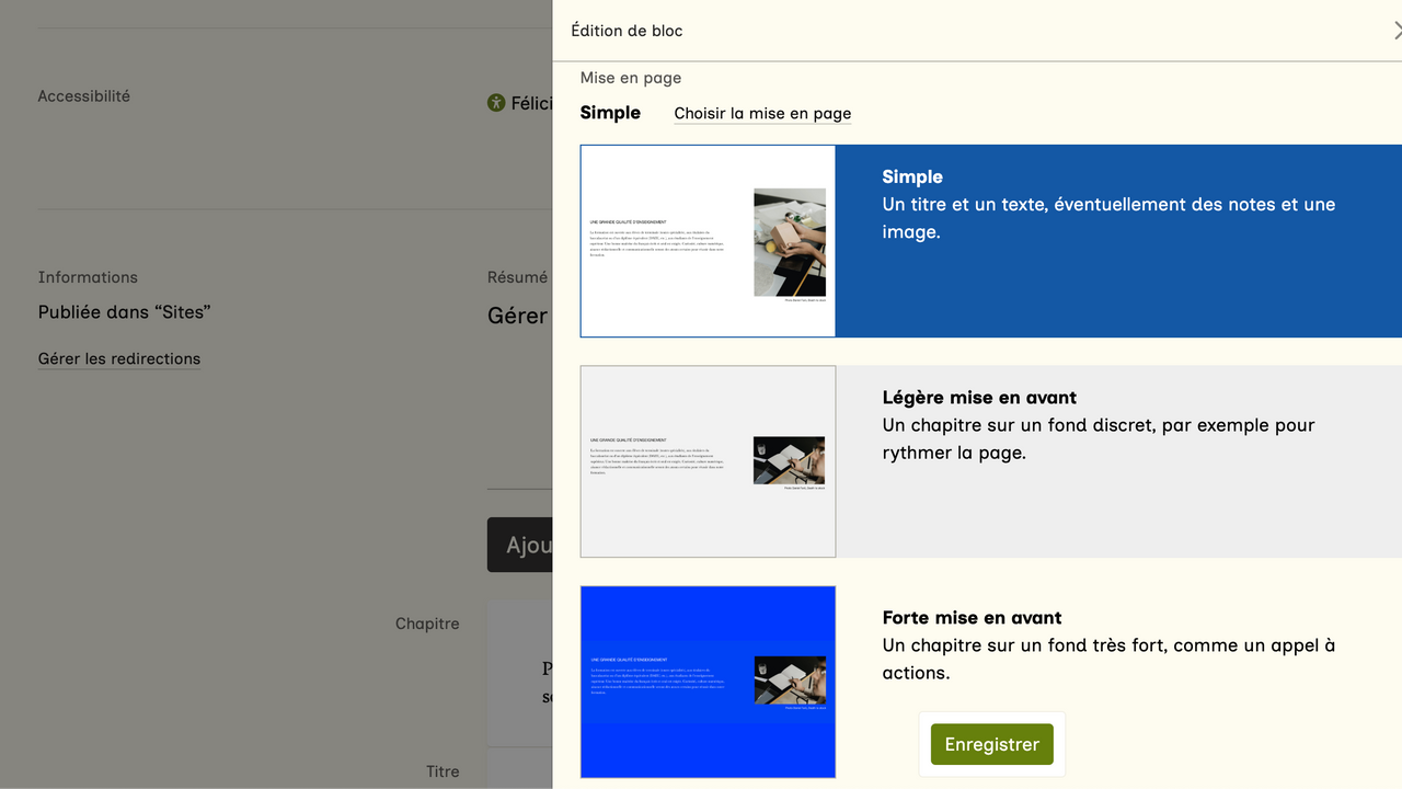 Vous pouvez choisir la mise en page du bloc : une mise en page simple, une légère mise en avant du bloc ou une forte mise en avant du bloc.