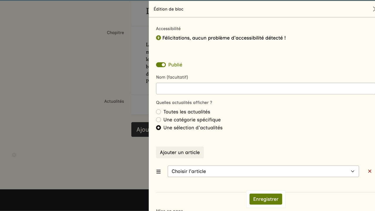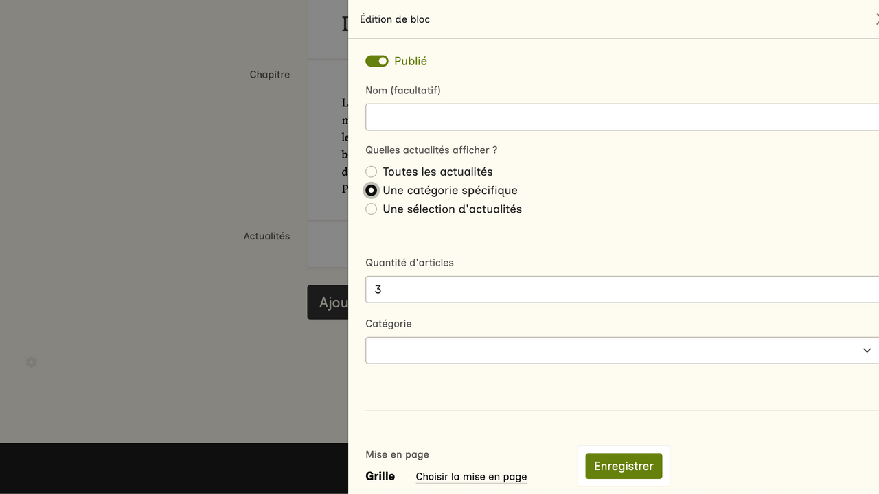 Vous pouvez choisir les actualités à afficher : toutes les actualités, une catégorie spécifique ou une sélection d'actualités. Vous pouvez également définir un nombre maximum d'actualités à afficher.