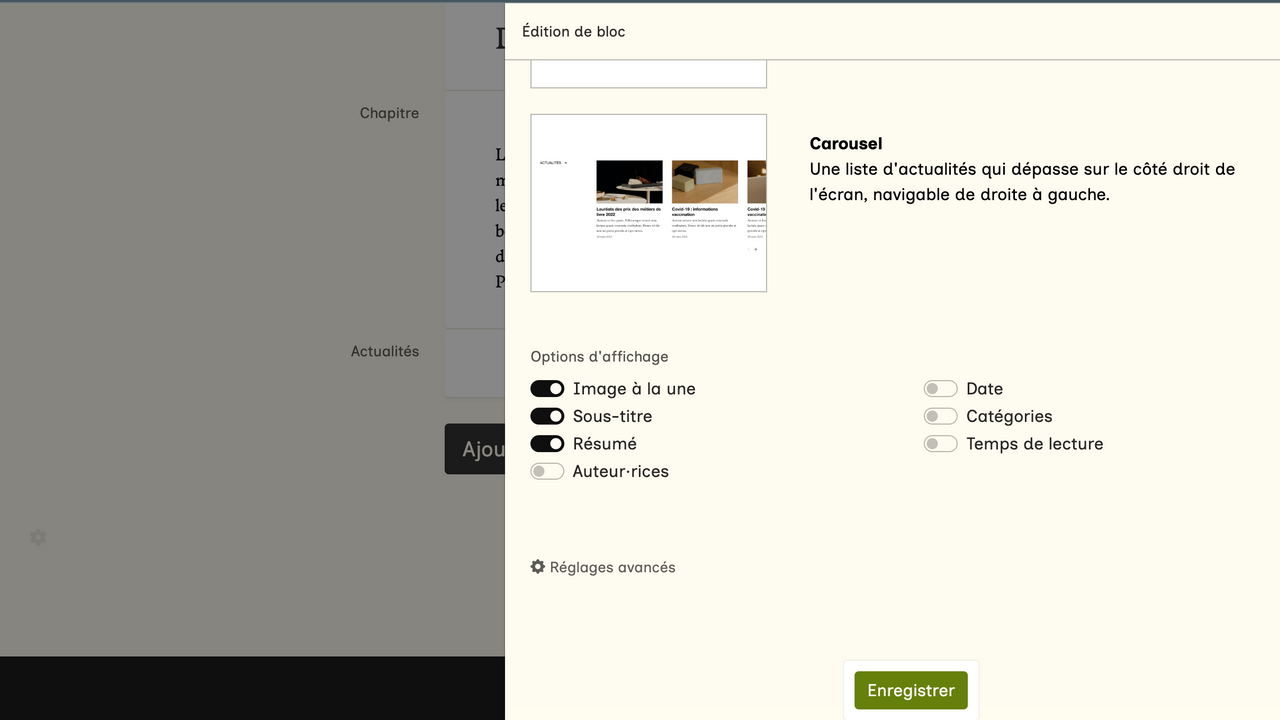 Vous pouvez choisir d'afficher ou non une image à la une, un sous-titre, un résumé, le nom des auteur.rice.s, une date, une catégorie ou encore un temps de lecture.