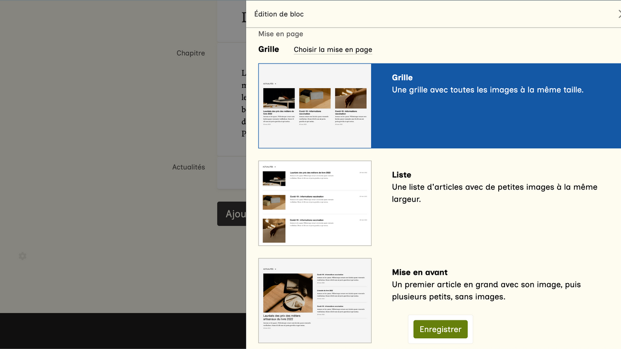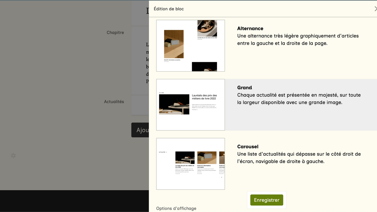 Vous pouvez choisir la mise en page du bloc : une mise en page en grille, en liste, avec une mise en avant, en grand, en alternance ou en carousel.