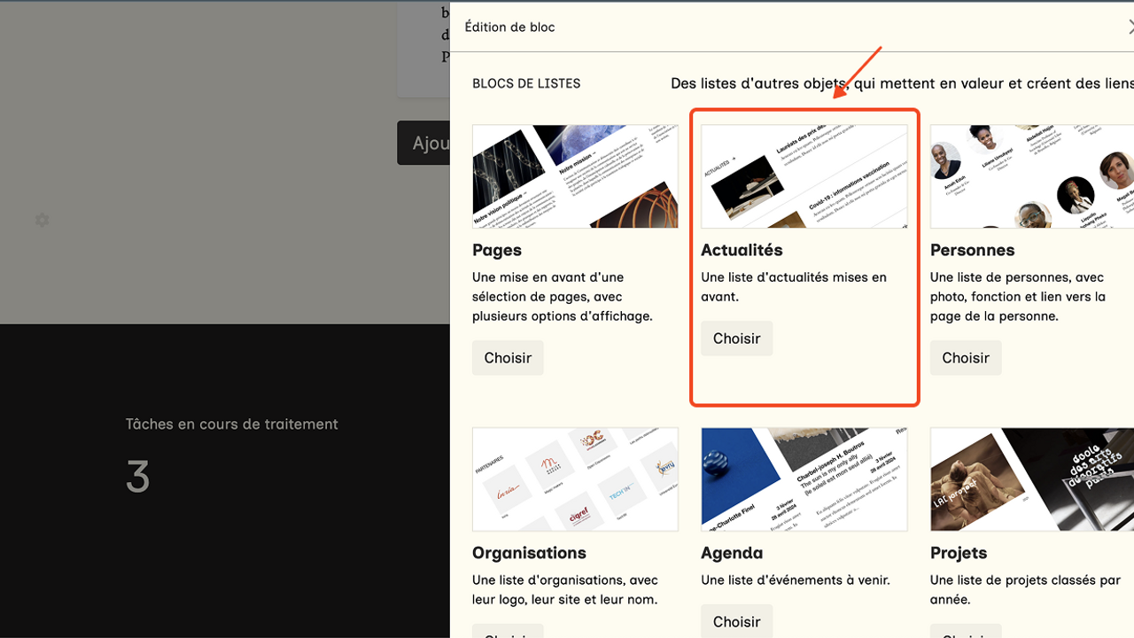 Cliquez sur le bloc Actualités pour l'ajouter.
