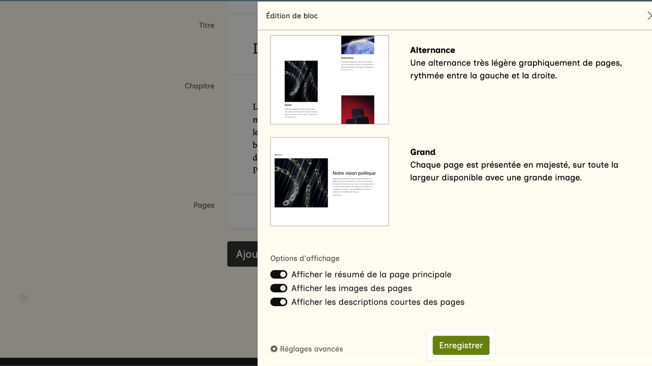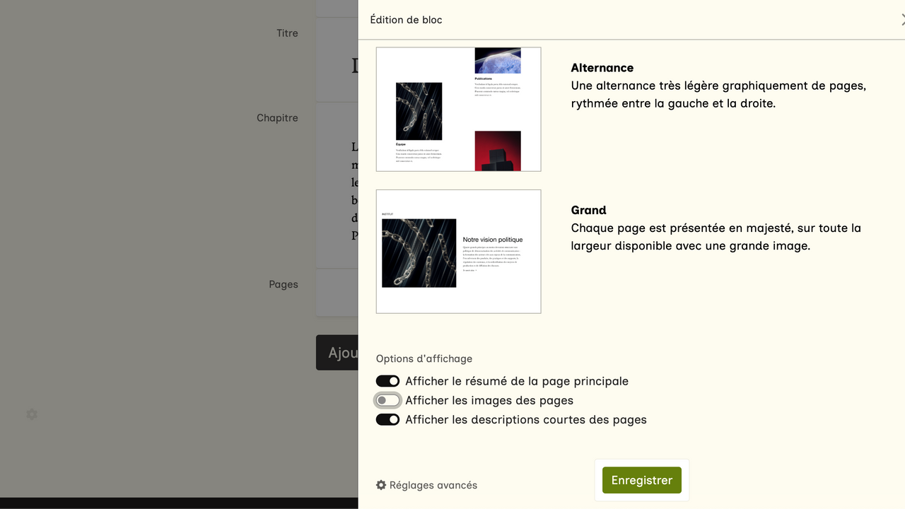 Vous pouvez choisir les options d'affichage de la liste de pages affichée : afficher une courte description de la page principale, afficher des courtes descriptions des pages sélectionnées, ou encore afficher les images des pages.