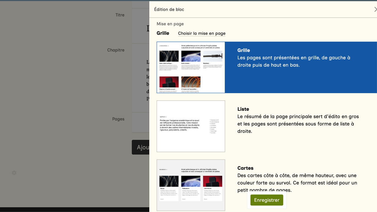 Vous pouvez choisir la mise en page du bloc : une mise en page en grille, en liste, en cartes ou en alternance.