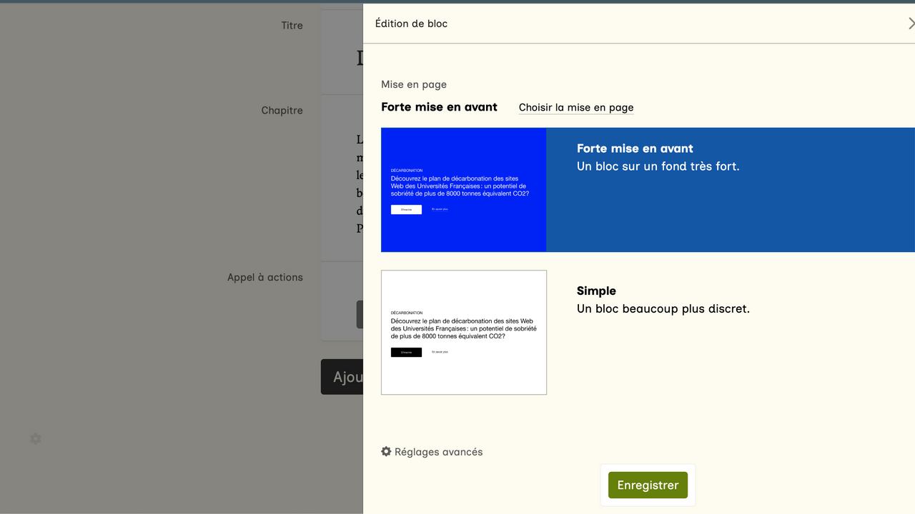 Vous pouvez choisir la mise en page du bloc : une forte mise en avant ou une mise en avant simple.