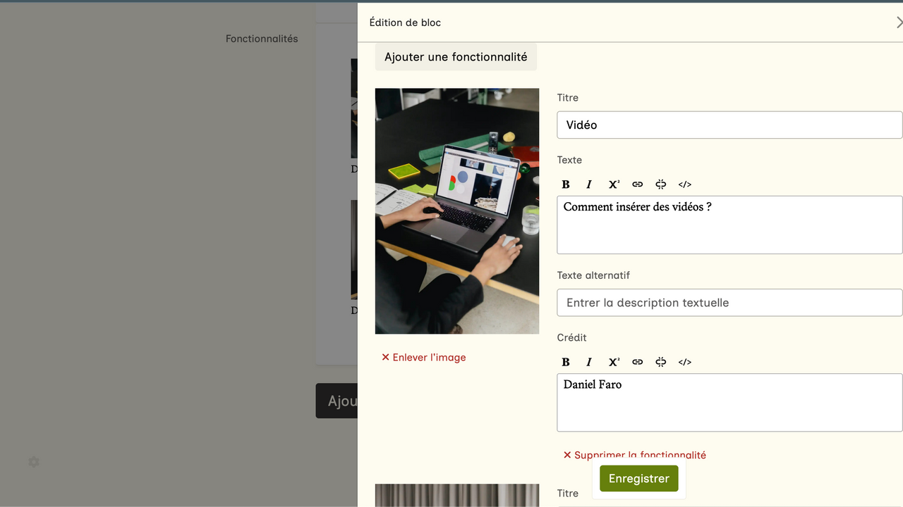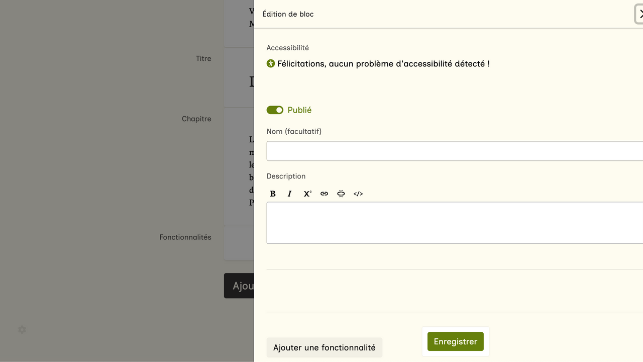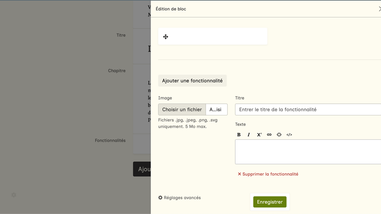 Vous pouvez insérer un nom et une description à votre bloc. Cliquez sur "Ajouter une fonctionnalité" pour ajouter des fonctionnalités.