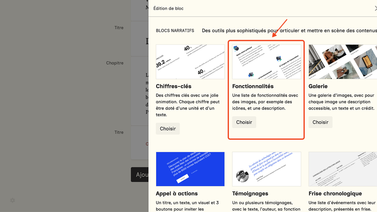 Cliquez sur le bloc fonctionnalités pour l'ajouter.