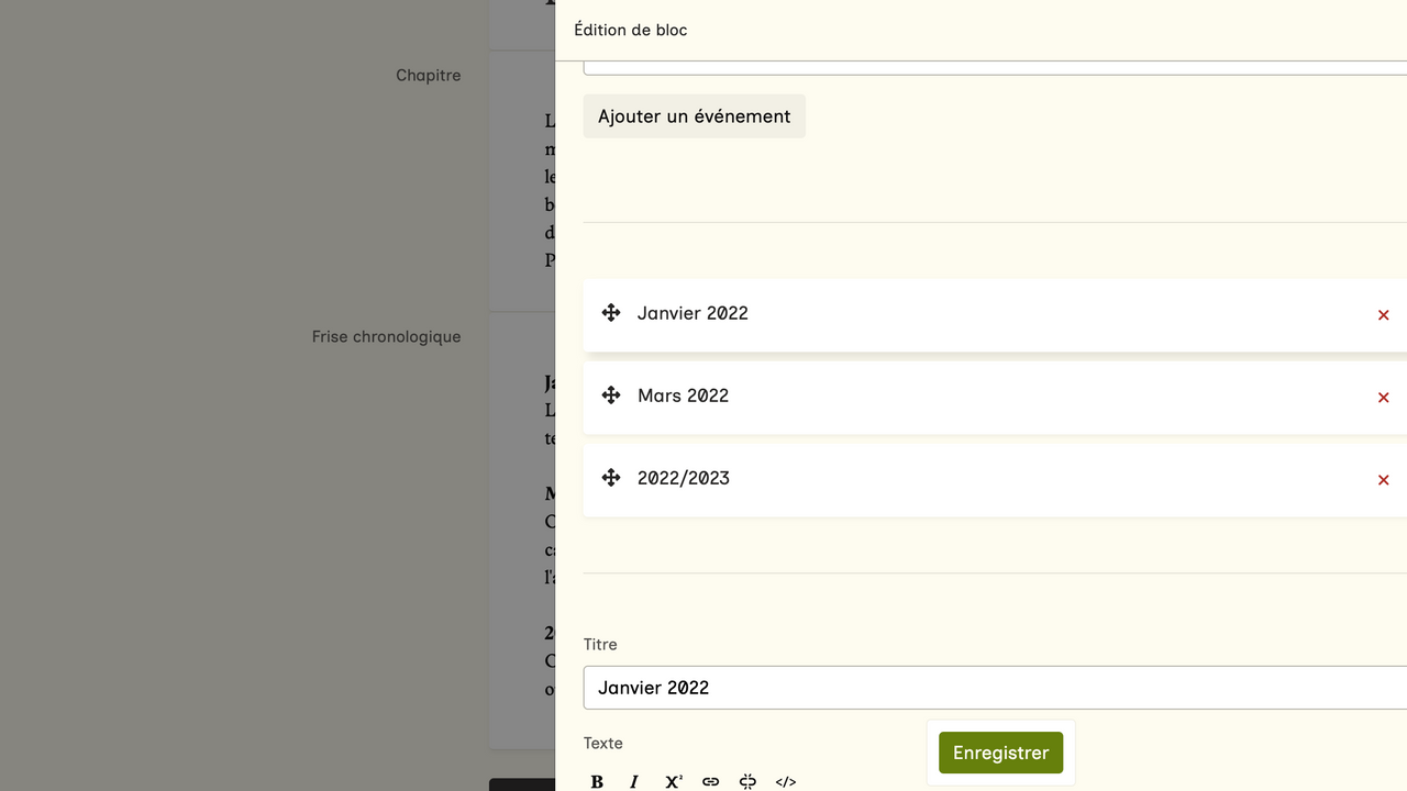 Ce bloc vous permet d'ajouter une liste d'événements avec leur description, présentés en frise.