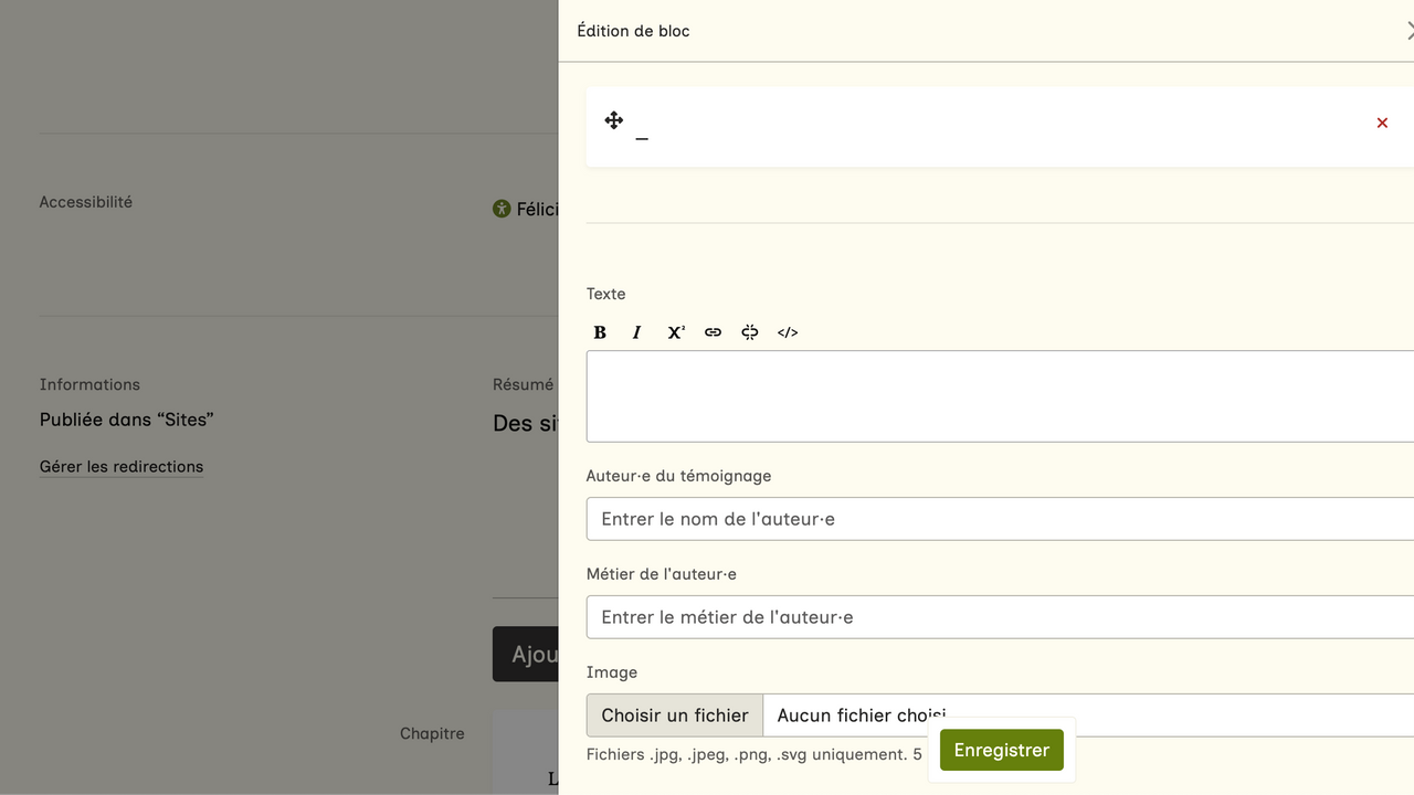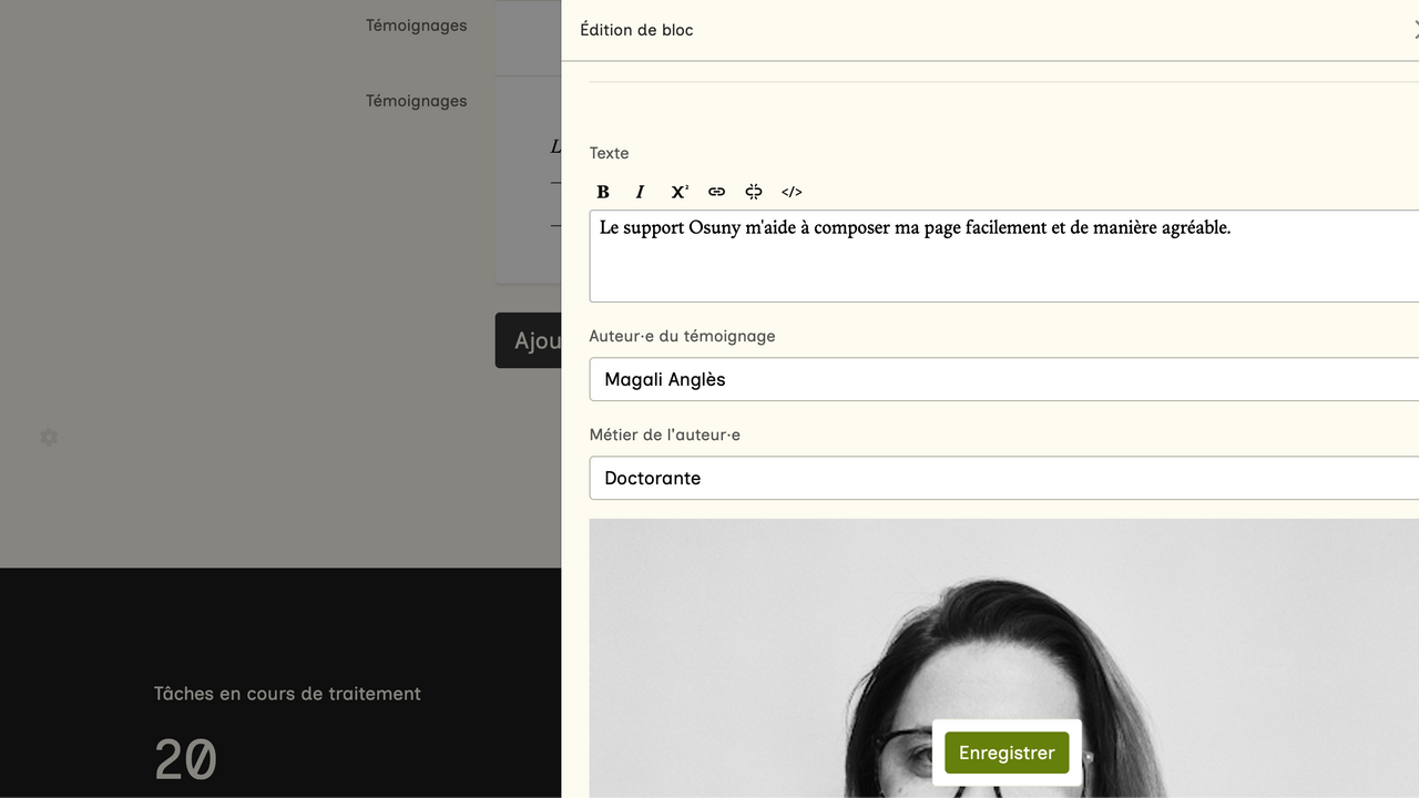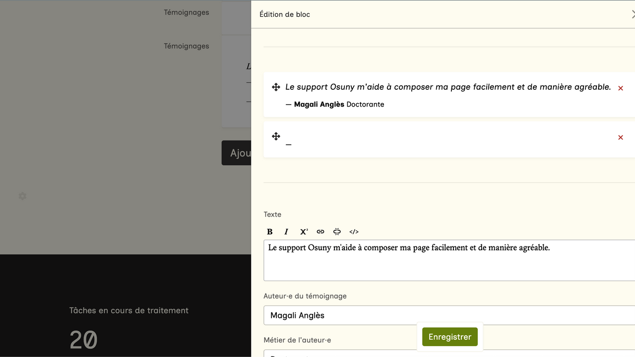 En cliquant sur "Ajouter un témoignage", vous pouvez rentrer le texte associé, l'auteur.e, son métier et une image associée.