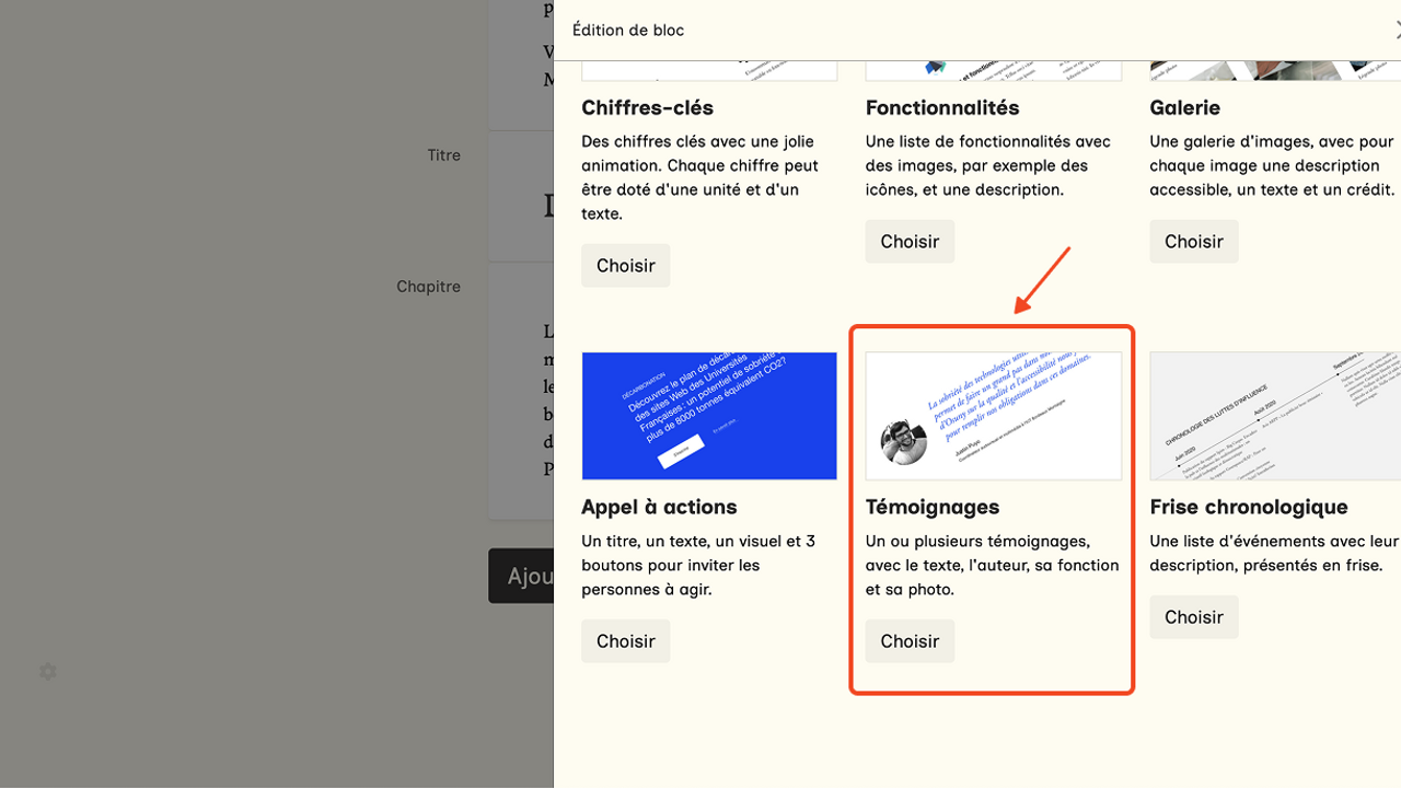 Cliquez sur le bloc témoignages pour l'ajouter.