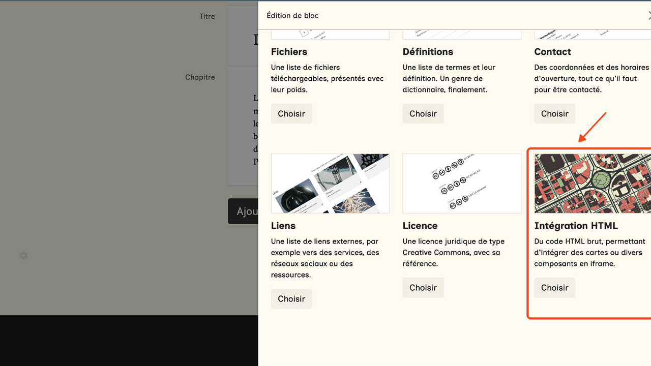 Le bloc fichiers vous permet d'ajouter du code html brut, permettant d'intégrer des cartes ou divers composant en iframe.
