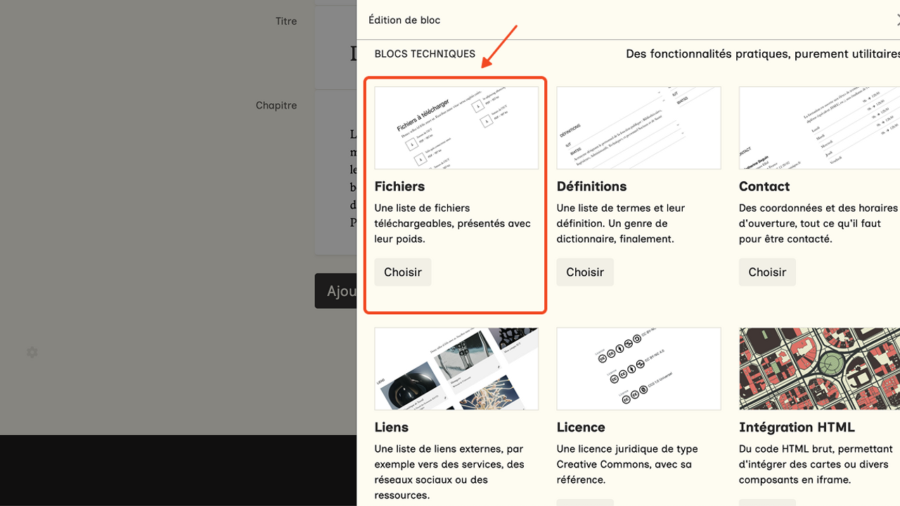 Cliquez sur le bloc fichiers pour l'ajouter.