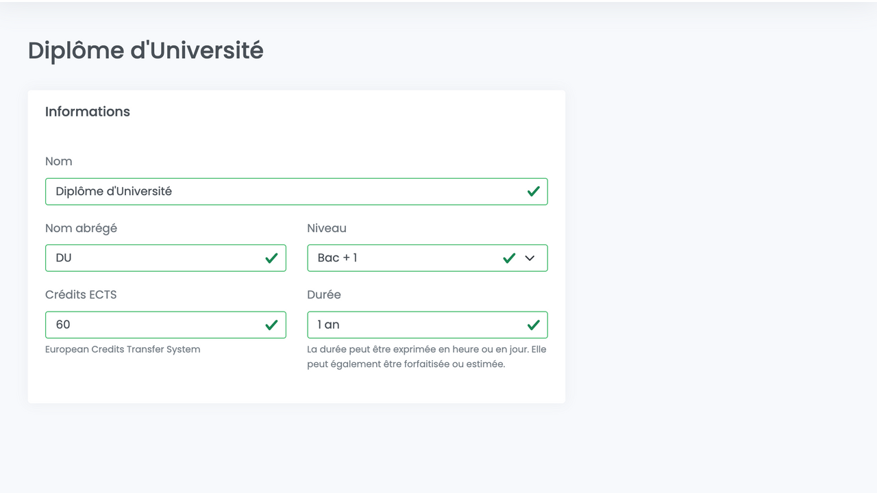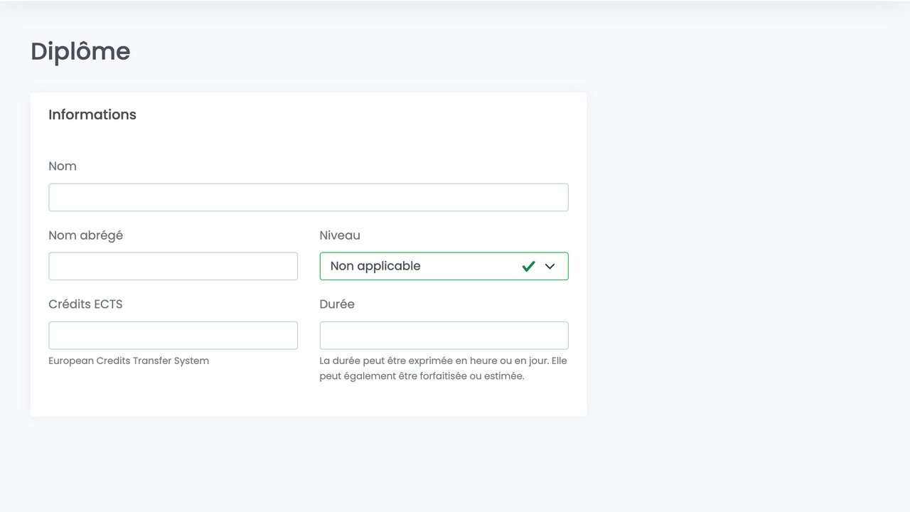 L'utilisateur.rice peut créer un diplôme avec les champs suivants :