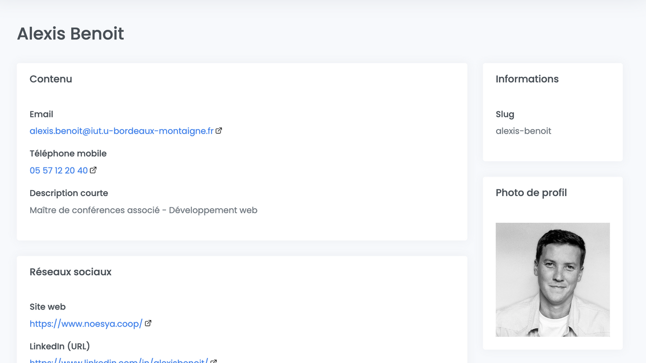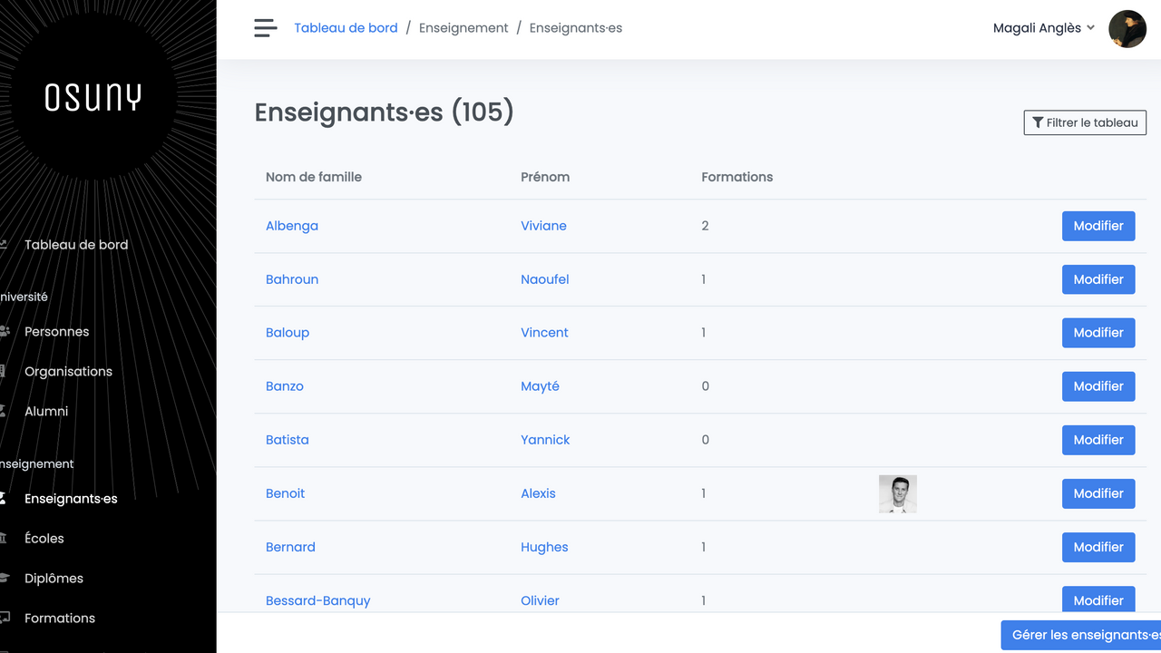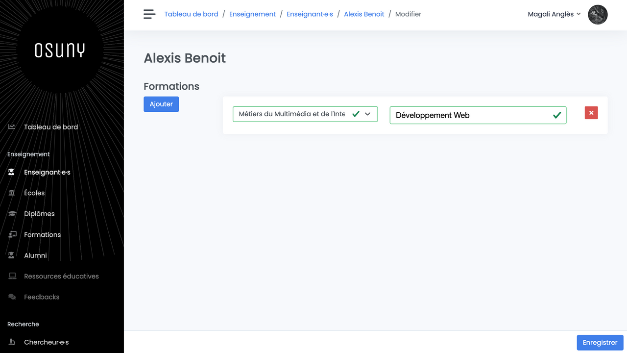 L'utilisateur.rice en cliquant sur "Gérer les enseignants" accède à la rubrique Personnes (lien externe), il ou elle peut ainsi créer, modifier ou supprimer des personnes. C'est dans la fiche de la personne qu'il faut choisir le statut Enseignant.e.