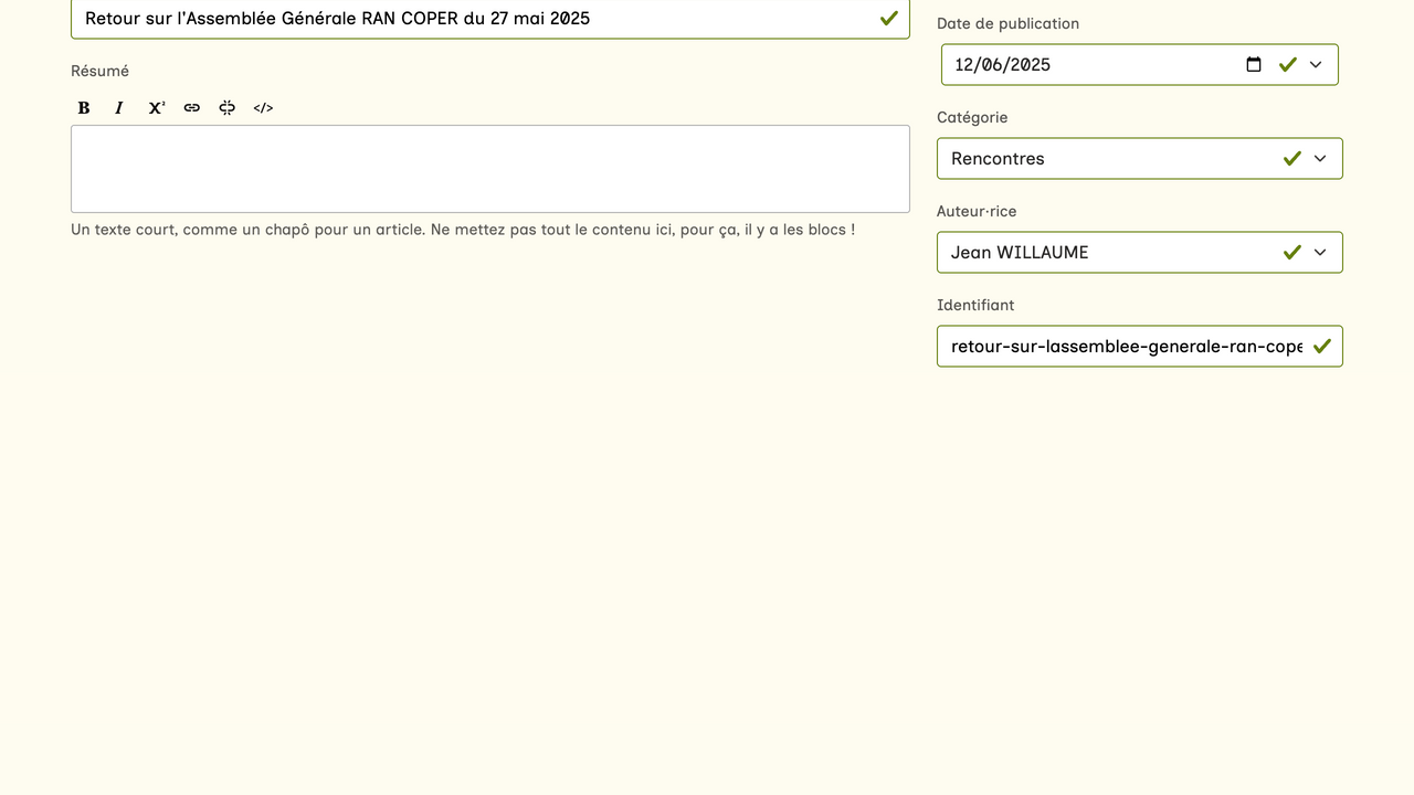 Pour associer une actualité à une catégorie, il faut d'abord créer les catégories. Ensuite, allez sur la page de modification des informations de l'actualité et sélectionnez la catégorie souhaitée dans la liste déroulante.