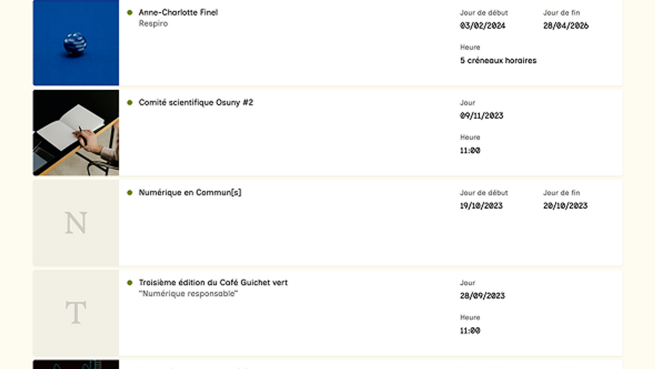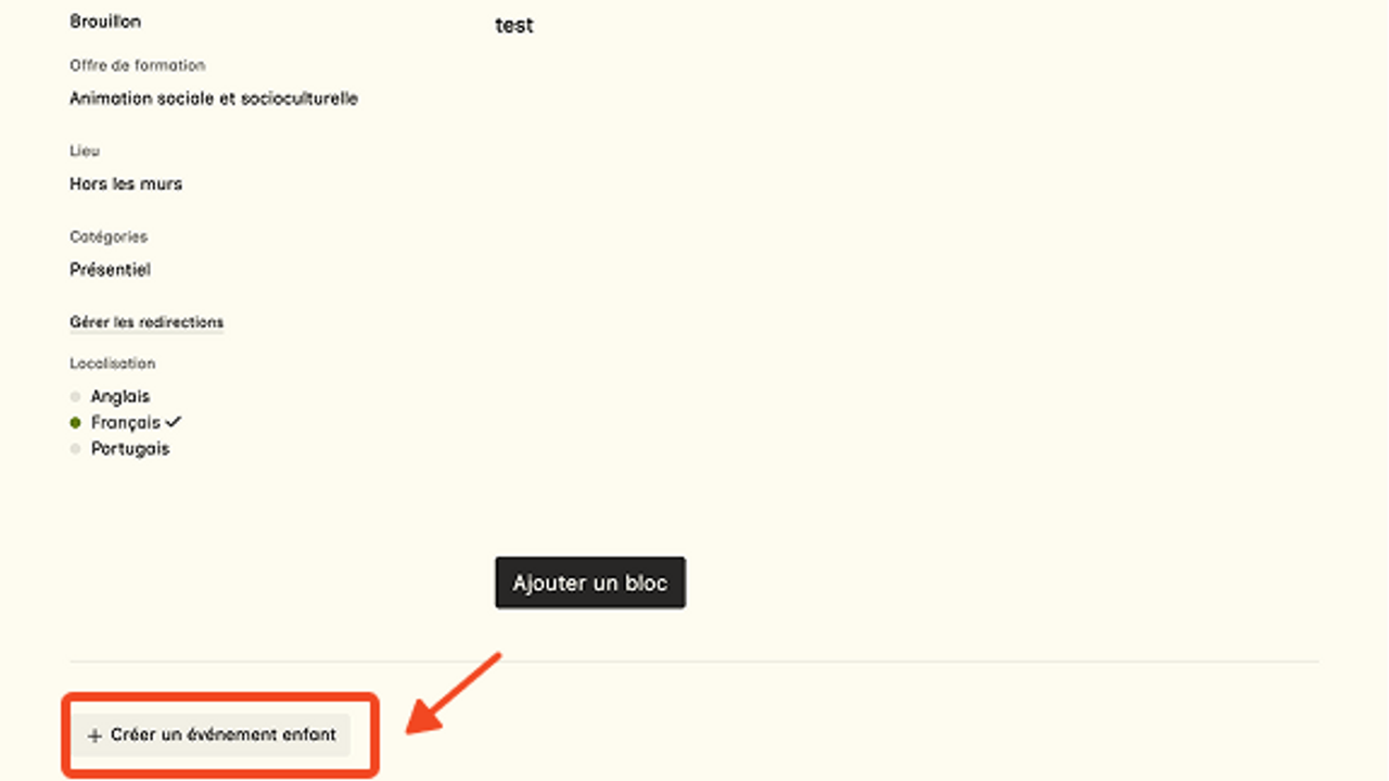 Vous pouvez utiliser l'agenda pour créer un événement "parent" et ensuite ajouter des événements associés, appelés "enfant". Par exemple une journée d'études avec des conférences successives ou un festival de musique. Aucun créneau horaire n'est possible sur les événements "parent", ceux-ci sont effectifs sur les événements "enfant".