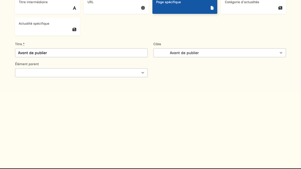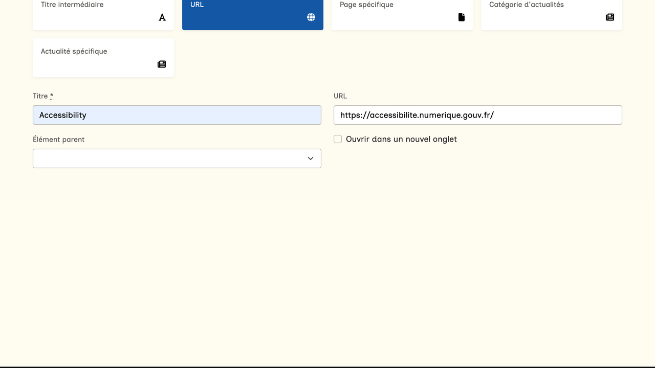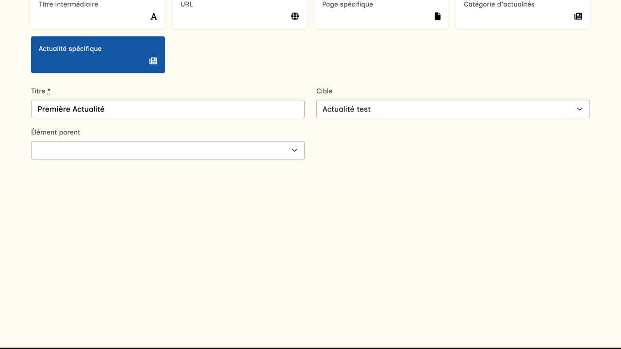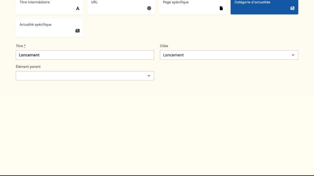 Comme indiqué dans la section "Créer votre menu (lien externe)", vous pouvez ajouter des liens vers des pages de votre site web dans votre menu, mais vous pouvez également ajouter d'autres éléments tels que des titres, des liens vers des catégories d'actualités ou une actualité spécifique, ou encore des liens renvoyant vers une URL d'un site web externe.