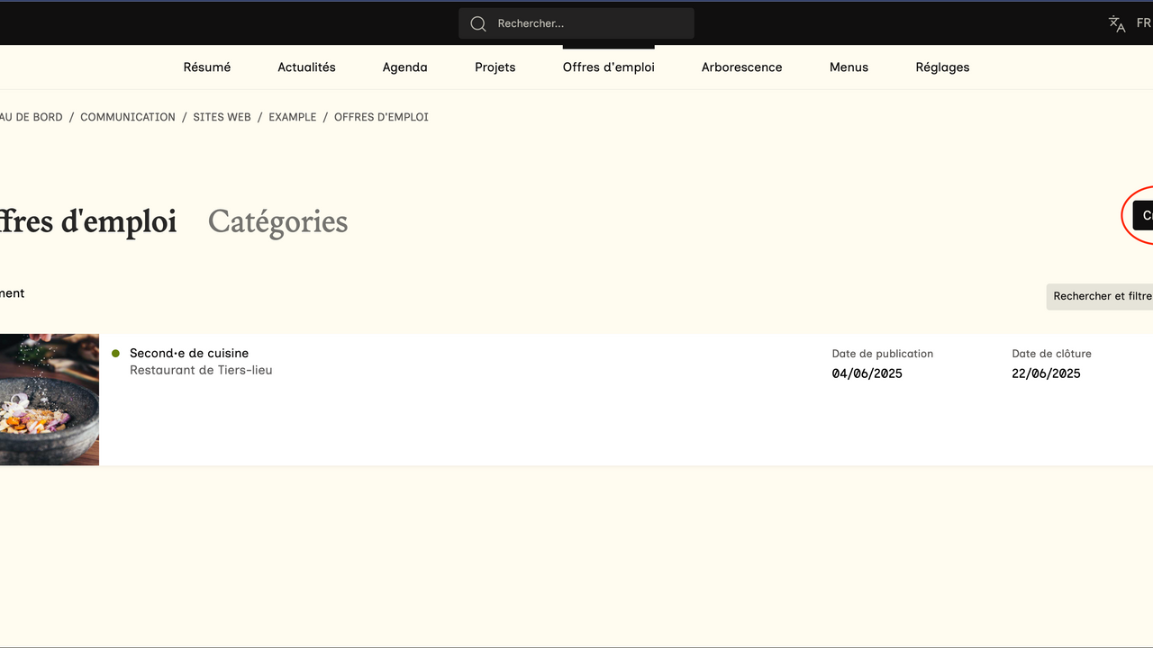 Pour créer une nouvelle offres d'emploi, vous devez cliquer sur l'onglet "offres d'emploi", puis sur le bouton "Créer"en haut à droite.