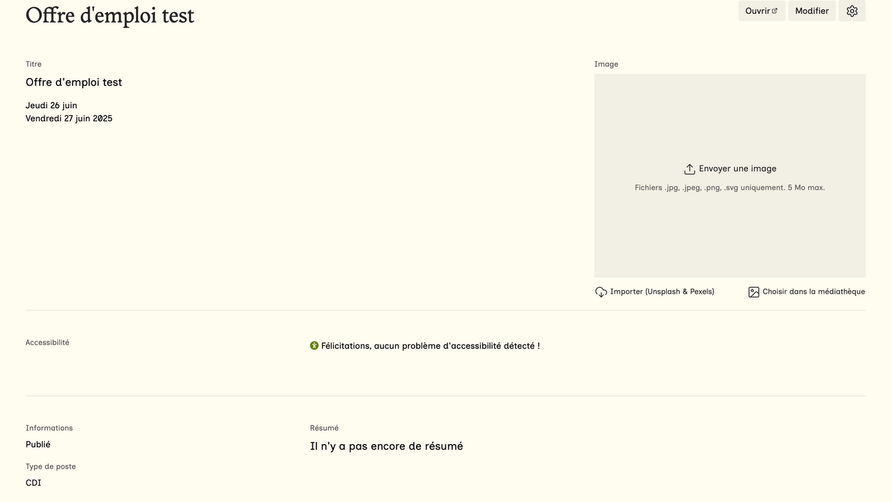 Il s'agit des informations essentielles à remplir lors de la création d'une offre d'emploi : le titre de votre offre d'emploi, un résumé, la date de publication et de clôture. Vous pouvez choisir de publier ou non la page.