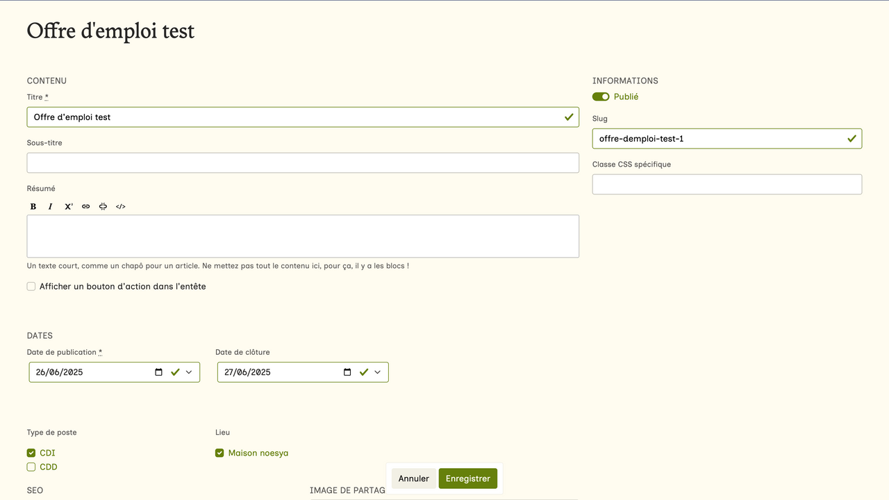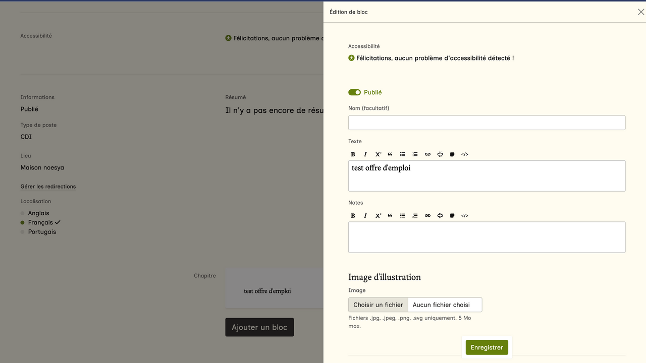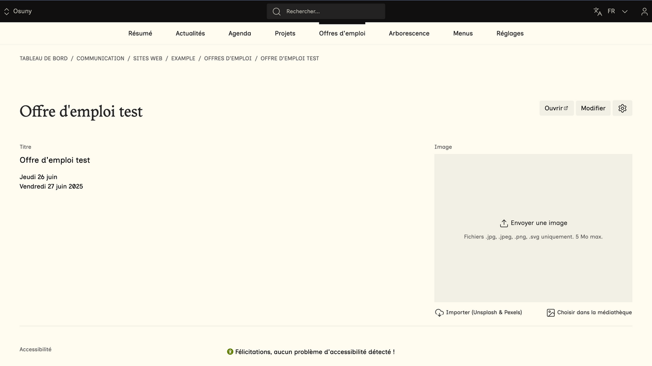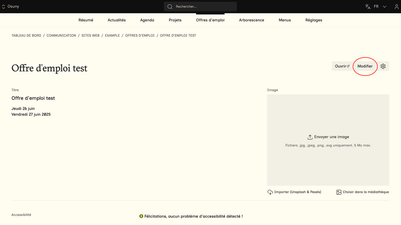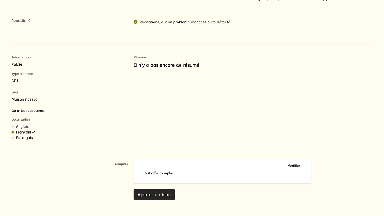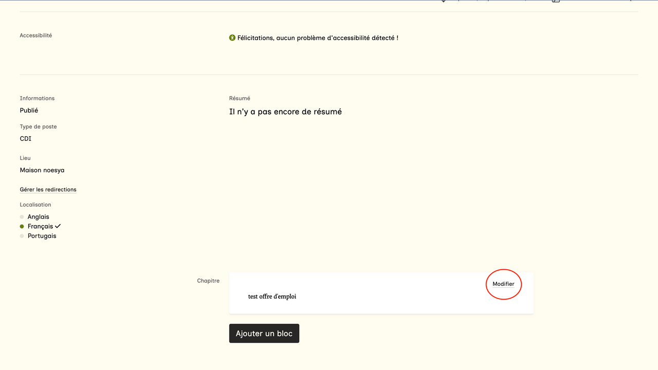 Vous pouvez modifier les blocs de contenu de votre offre d'emploi ainsi que les informations de votre offre d'emploi. Ces actions sont séparées. Pour modifier vos offres d'emploi, cliquez sur l'onglet "offre d'emploi". Ensuite, vous pouvez accéder à l'offre d'emploi souhaitée en cliquant sur le nom de offre d'emploi.