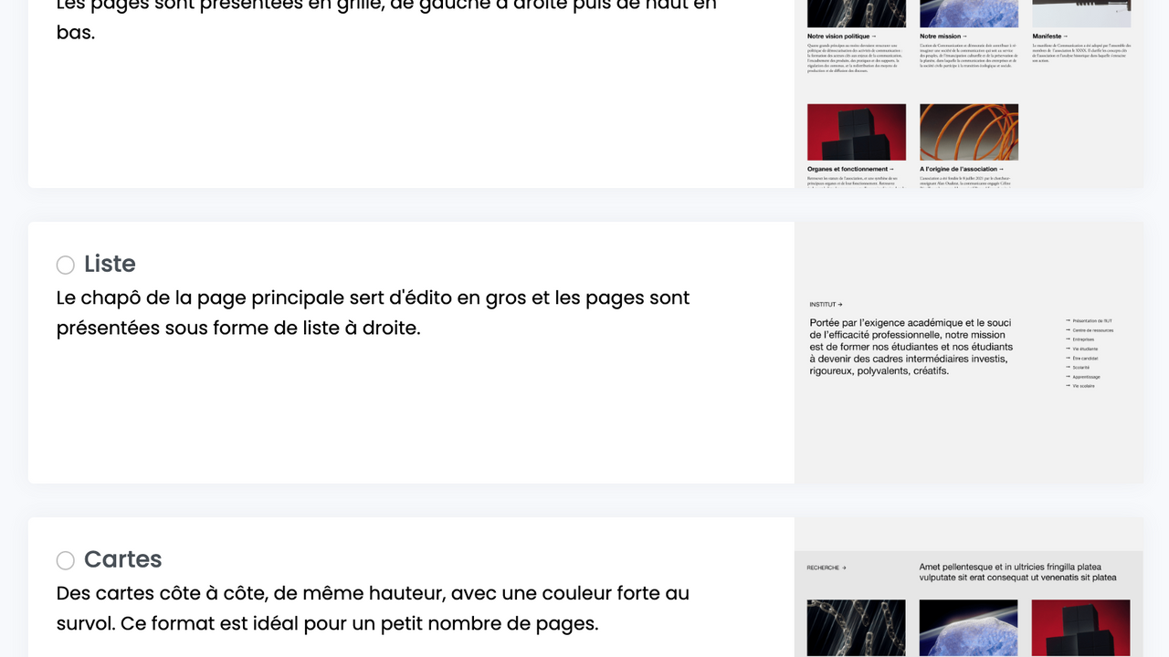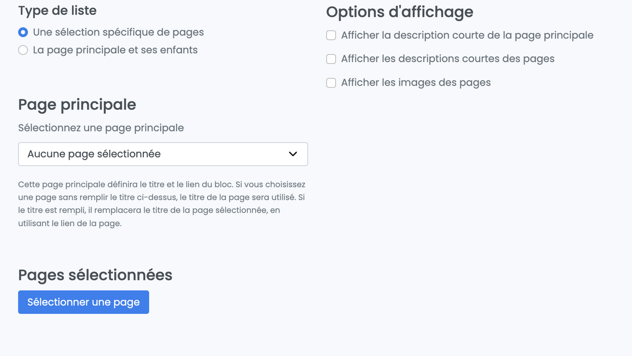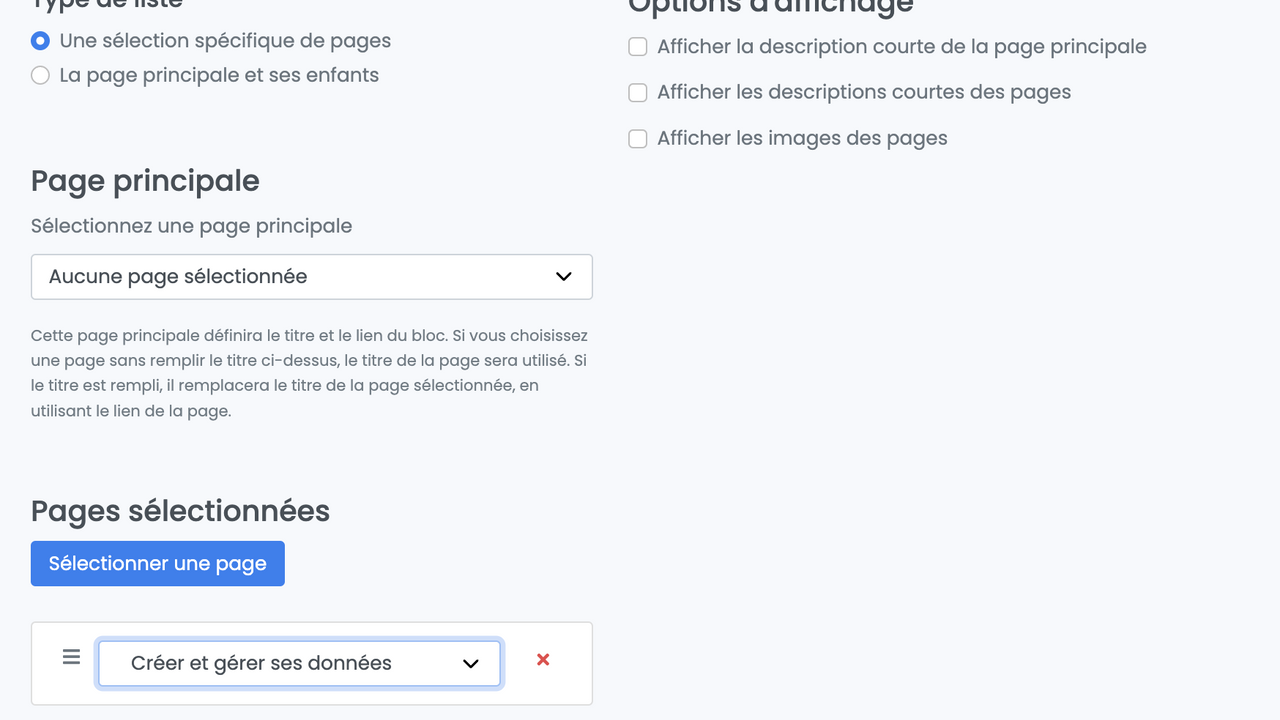 - Type de liste : choix entre une sélection spécifique de pages / La page principale et ses enfants