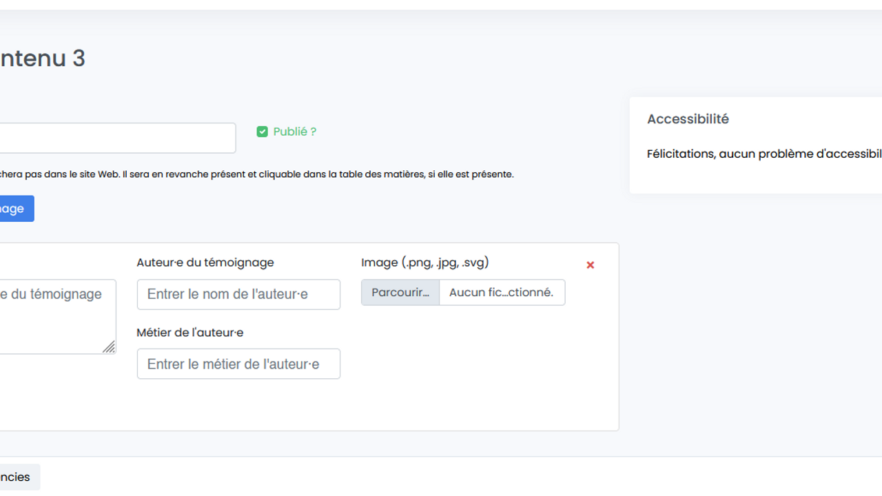 - Ajouter un ou plusieurs témoignages : texte/ auteur.e du témoignage/ métier de l'auteur.e / Image (choisir un fichier)