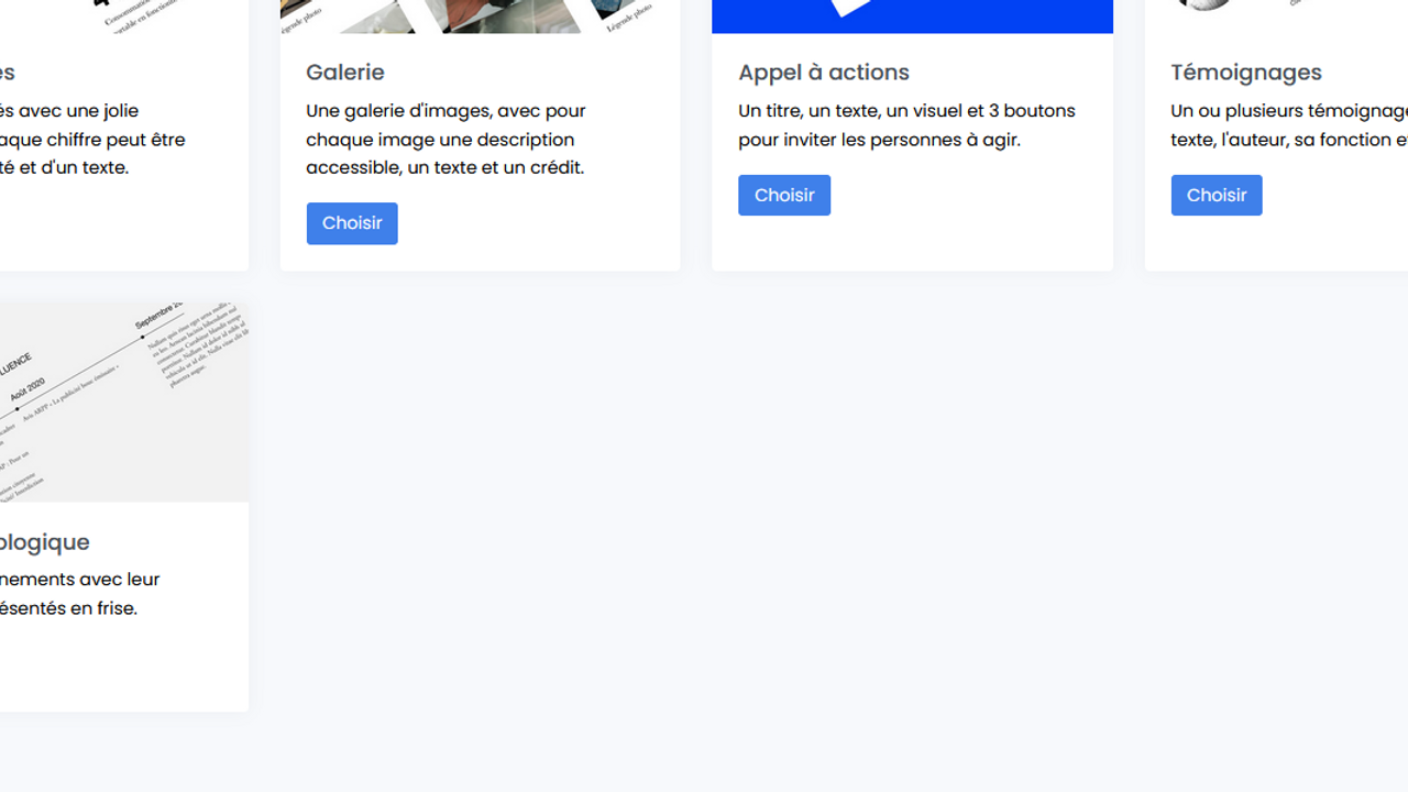 L'utilisateur peut ajouter une liste d'événements avec leur description, présentés en frise. L'utilisateur rentre les champs suivants pour ajouter un bloc frise :