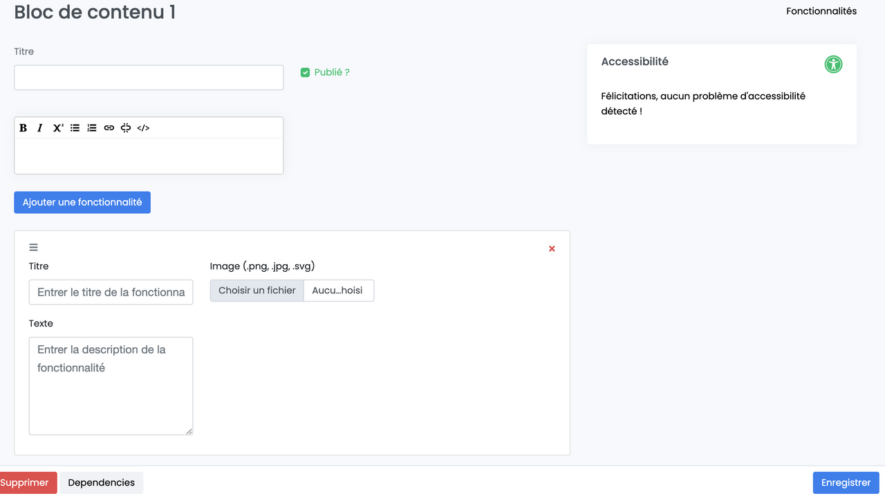 Vous trouverez différents types d'exemples de mise en page du bloc Fonctionnalités sur Example.osuny.org (lien externe)