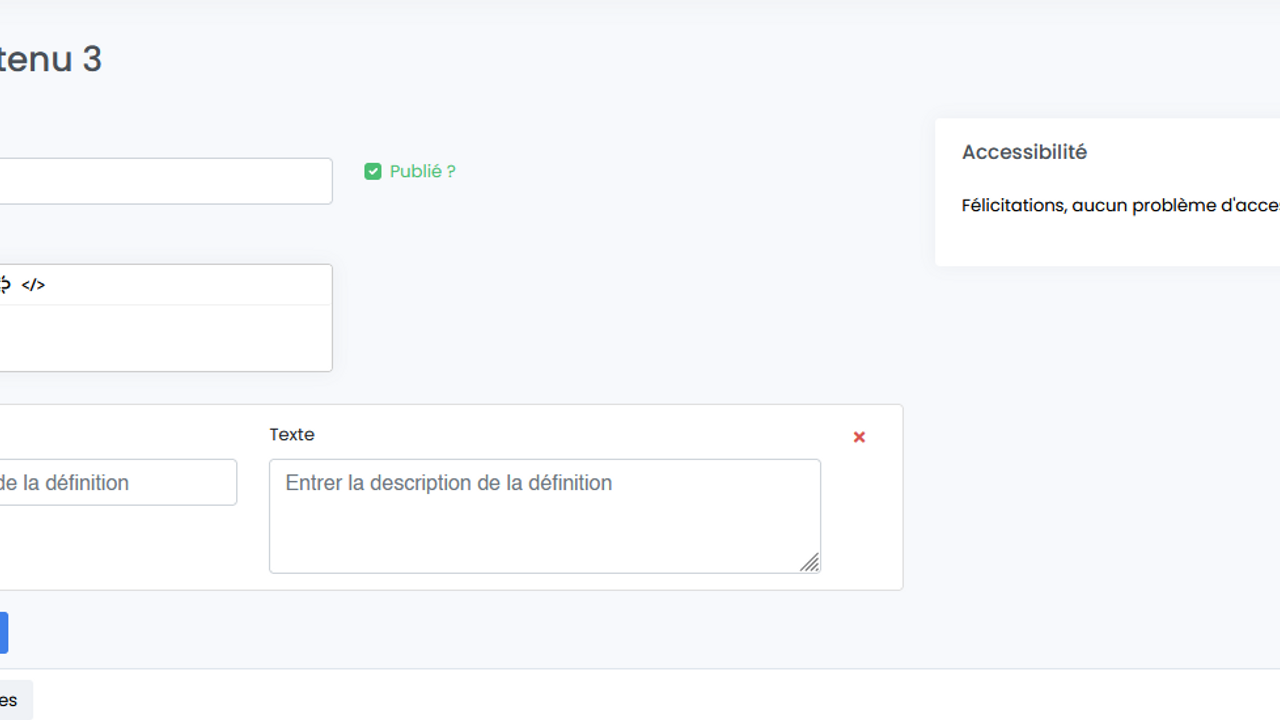 L'utilisateur peut ajouter une liste de termes et leur définition. Un genre de dictionnaire, finalement. L'utilisateur rentre les champs suivants pour ajouter un bloc définitions :