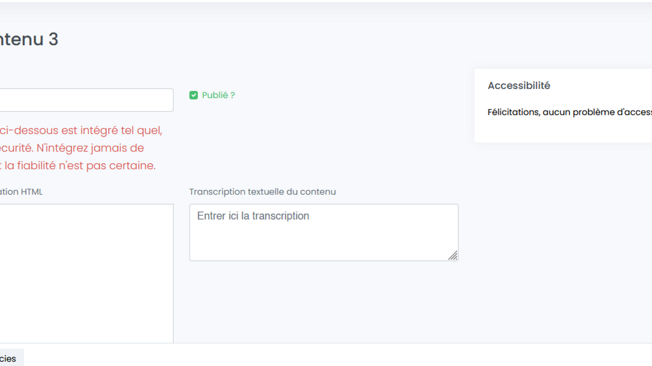 L'utilisateur peut ajouter du code HTML brut, permettant d'intégrer des cartes ou divers composants en iframe.