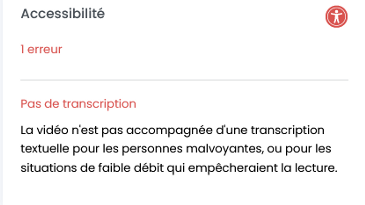 Une information sur l'accessibilité de la page est indiqué à chaque création de blocs. L'idée est d'être le plus conforme avec le Référentiel général d'amélioration de l'accessibilité (RGAA (lien externe)).