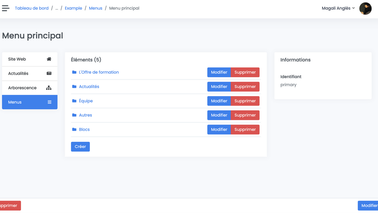 L'utilisateur a accès aux éléments qui constituent le menu sélectionné. Il peut ensuite choisir de modifier, supprimer un élément du menu ou de créer un nouvel élément.