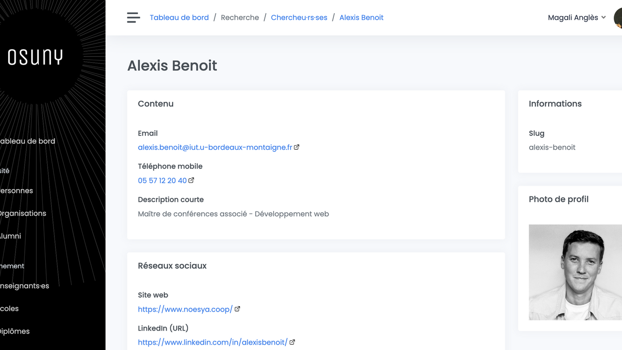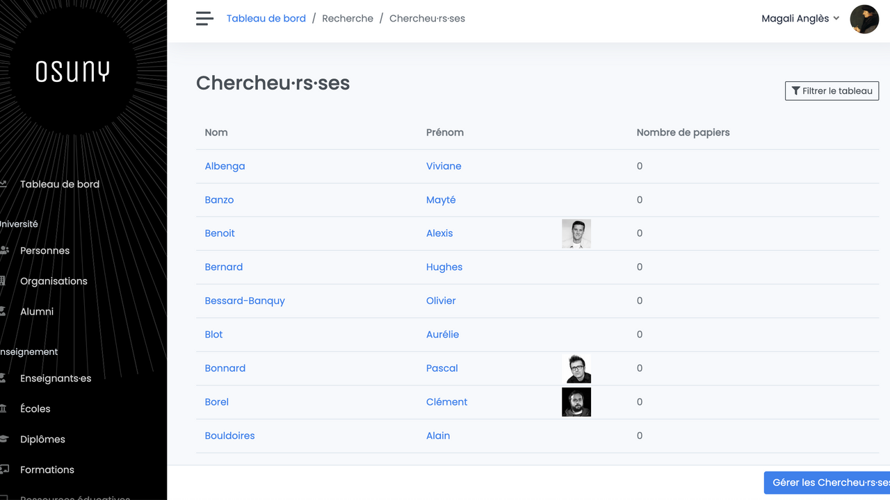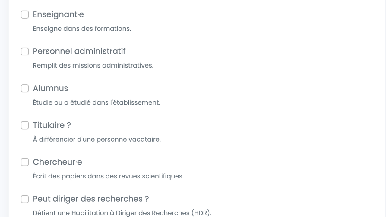 Pour créer un.e chercheur.e, il faut en premier créer une fiche dans la rubrique Personne (lien externe) et dans sa fiche indiquer le statut Chercheur.e. Ensuite cette personne apparaitra dans la rubrique Chercheur.e.