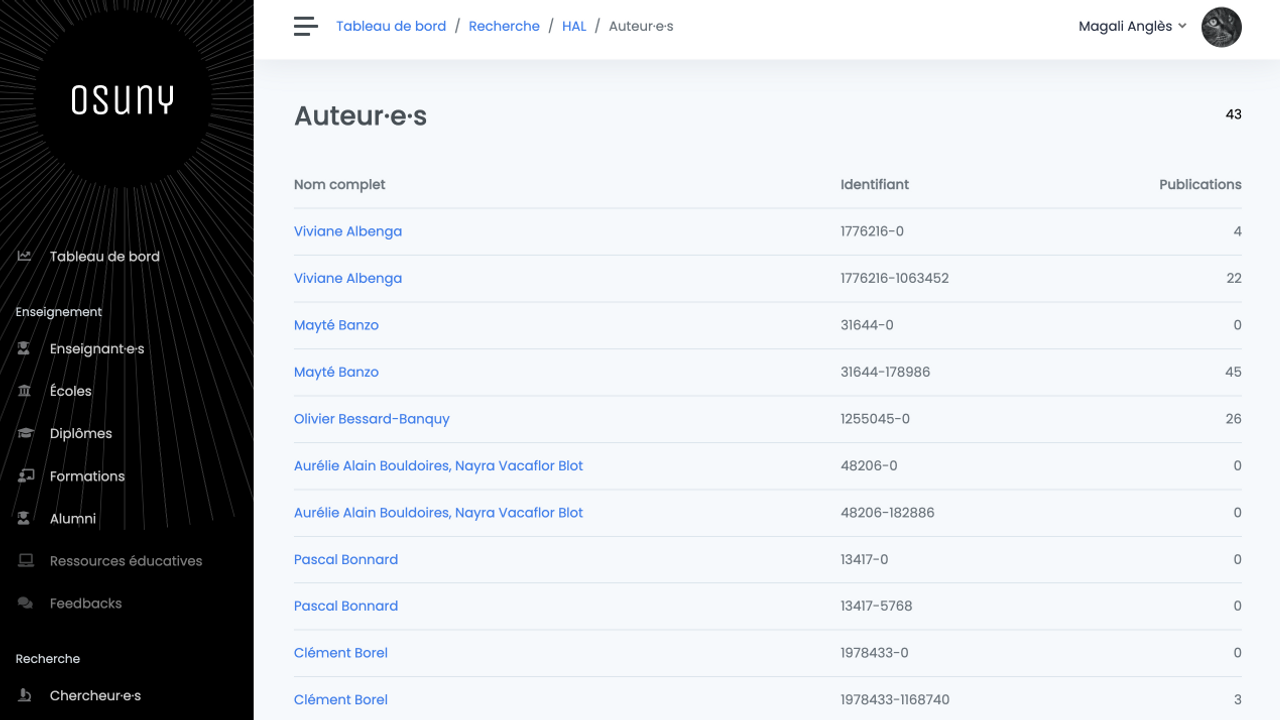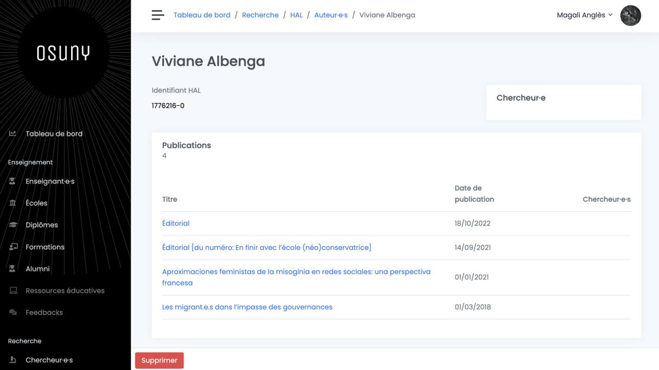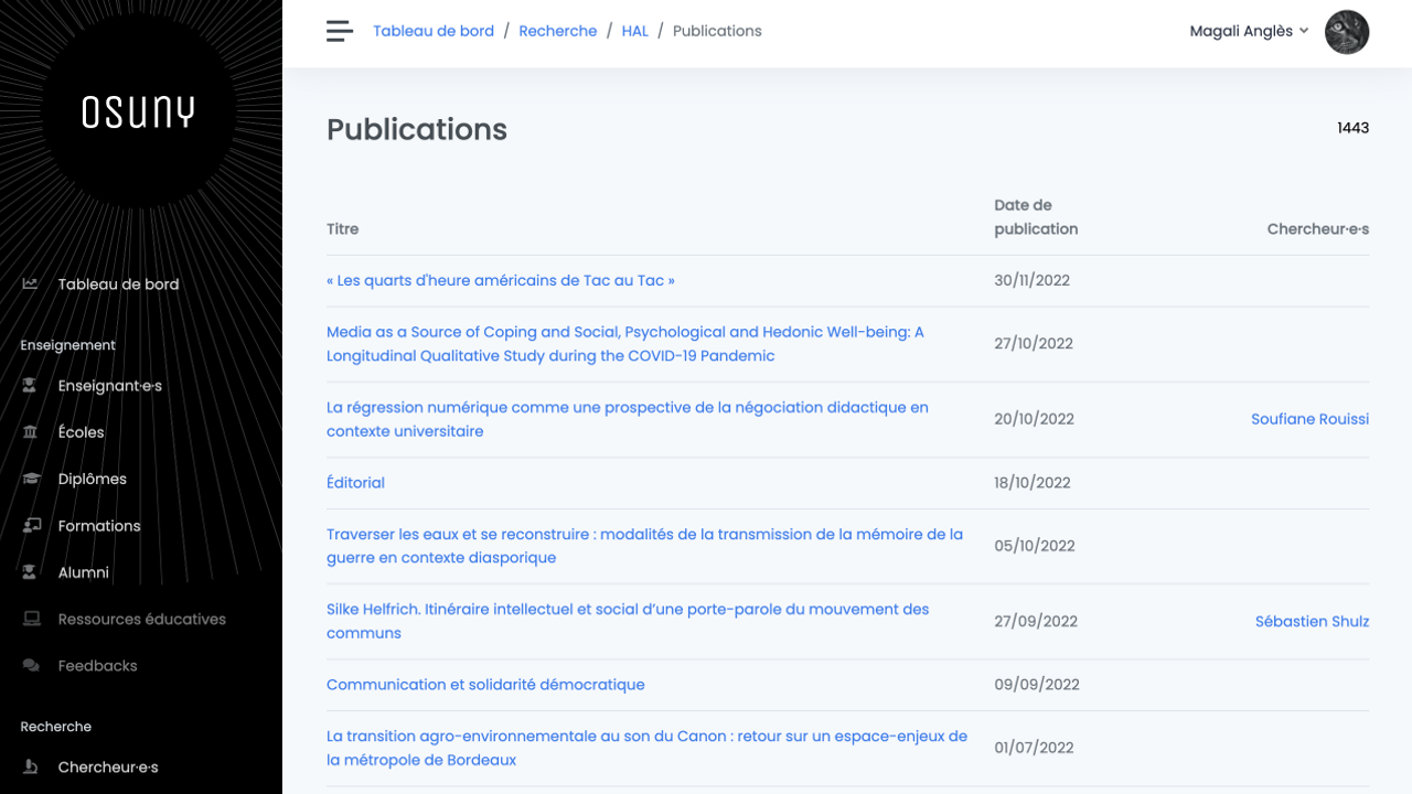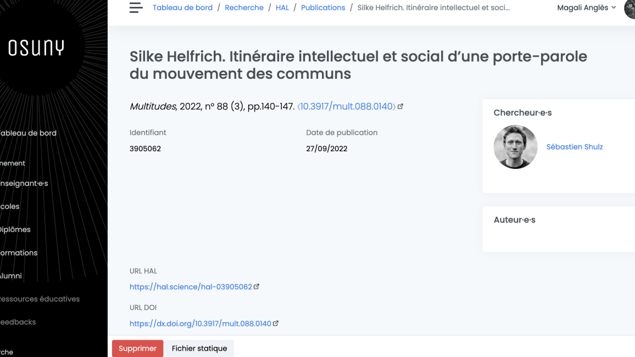 L'importation se fait automatiquement depuis la plateforme HAL. Une liste apparait avec le titre de chaque publication, sa date et le nom du chercheur.e associé.e.