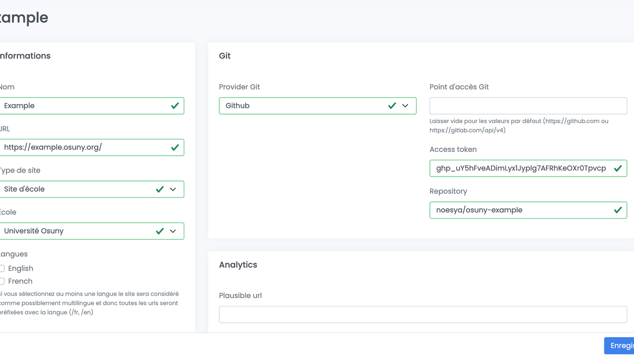 - Git : Provider Git / Point d'accès Git / Access Token / Repository